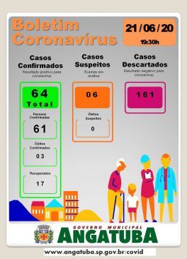 Hoje mais dois casos foram notificados como detectável, são duas mulheres, com a idade de 79 anos e 53 anos, os casos foram enviados pela vigilância epidemiológica de Guareí - SP que realizou os testes e encaminhou o resultado para Angatuba, os familiares dos detectáveis moram num bairro rural nas divisas do município de Guareí, porém serão atendidos pela equipe de saúde básica de nosso município. Com mais esses dois resultados, chegou a 64 casos do coronavírus em nossa cidade.