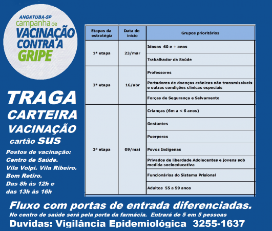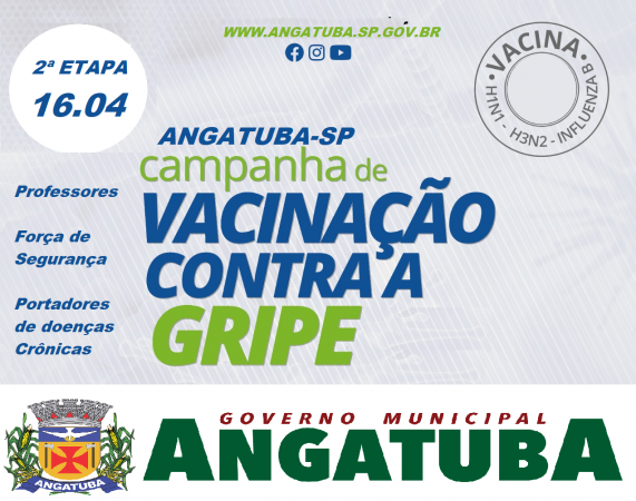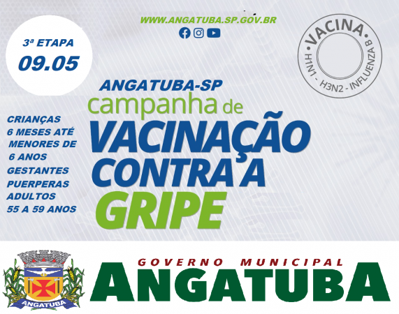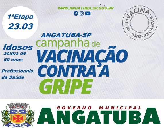 A Prefeitura de Município de Angatuba, incia a 1ª ETAPA da campanha de Vacinação contra a Gripe Influenza, hoje dia 23 de março inicia-se para idosos acima de 60 anos de idade e Profissionais de saúde, na 2ª ETAPA da campanha iniciará no dia 16 de Abril com a vacinação de Professores, Forças de Segurança e Salvamento, Portadores de doenças crônicas e na 3ª ETAPA da campanha iniciará no dia 09 de maio com a vacinação de crianças de 6 meses a 6 anos de idade, Gestantes, Puerperas, Indigenas e adultos dos 55 a 59 anos de idades.