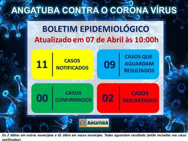 Boletim Epidemiológico nesse dia 07 de Abril, com novas atualizações dos casos, segue o numero de 11 casos notificados, sendo que 02 casos foram descartados, ficando 9 casos suspeitos, tendo em vista que 3 são óbitos em suspeita de COVID-19.