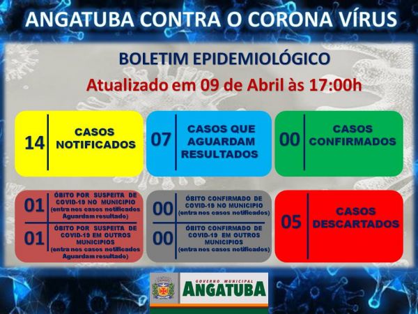 A Vigilância Epidemiológica informa que até o presente momento, constam 14 Casos Notificados, hoje subiu para 05 Casos descartados, sendo 07 Casos Suspeitos sendo monitorados pela Vigilância Epidemiológica e nenhum caso confirmado de COVID-19. Além desses resultados, temos duas mortes aguardando resultado.
