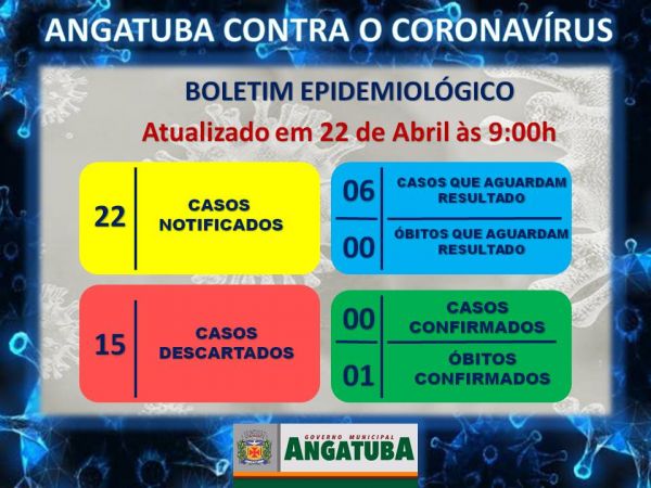 A Vigilância Epidemiológica informa que até o exato momento foram notificados 22 casos de suspeita de covid-19, sendo que desses casos, 6 aguardam resultado, 15 casos foram descartados (negativo) e 1 óbito confirmado de covid-19 de um paciente de 89 anos, que viajou para fora de Angatuba e dias depois apresentou sinais característicos de Síndrome Respiratória Aguda Grave.