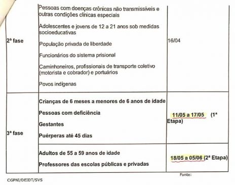 1ª etapa - 11 a 17 de maio para crianças de 6 meses a 6 anos, pessoas com deficiência, gestantes, puerperas ate 45 dias.