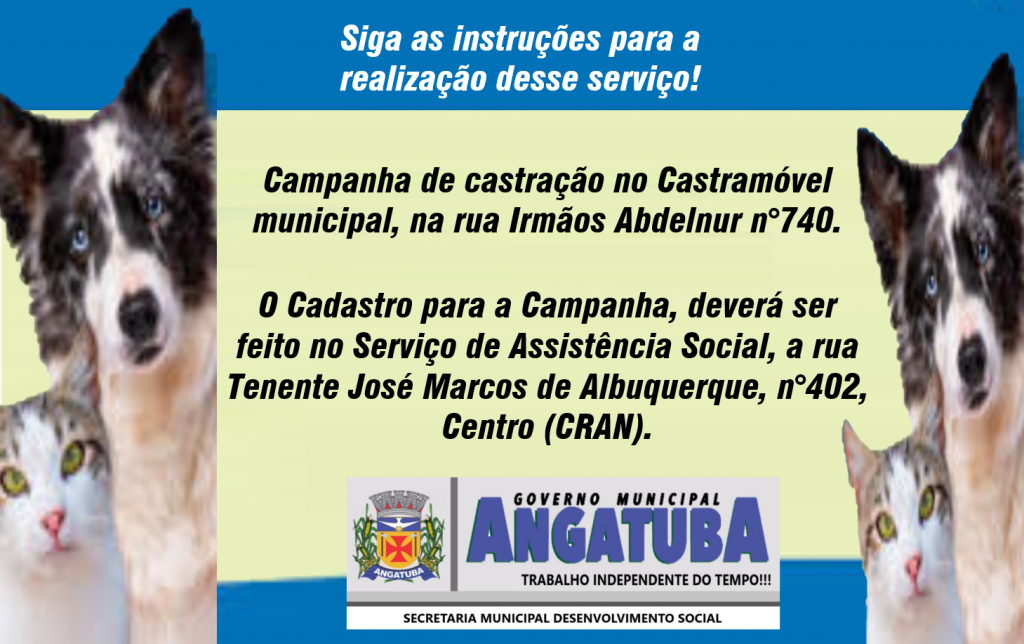 A Prefeitura de Angatuba comunica que nessa quarta feira (13) inicia a Campanha de castração no Castramóvel municipal, na rua Irmãos Abdelnur n°740. Siga as instruções para a realização desse serviço!