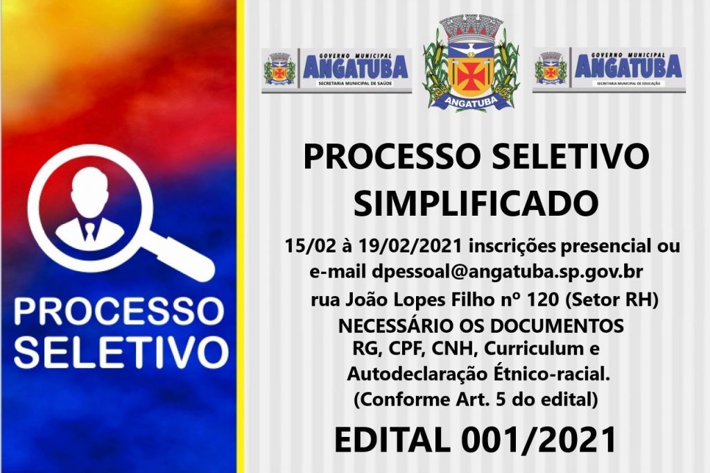 Processo Seletivo Simplificado 001/2021 da Prefeitura de Angatuba para as Secretarias Municipais de Educação e Saúde.