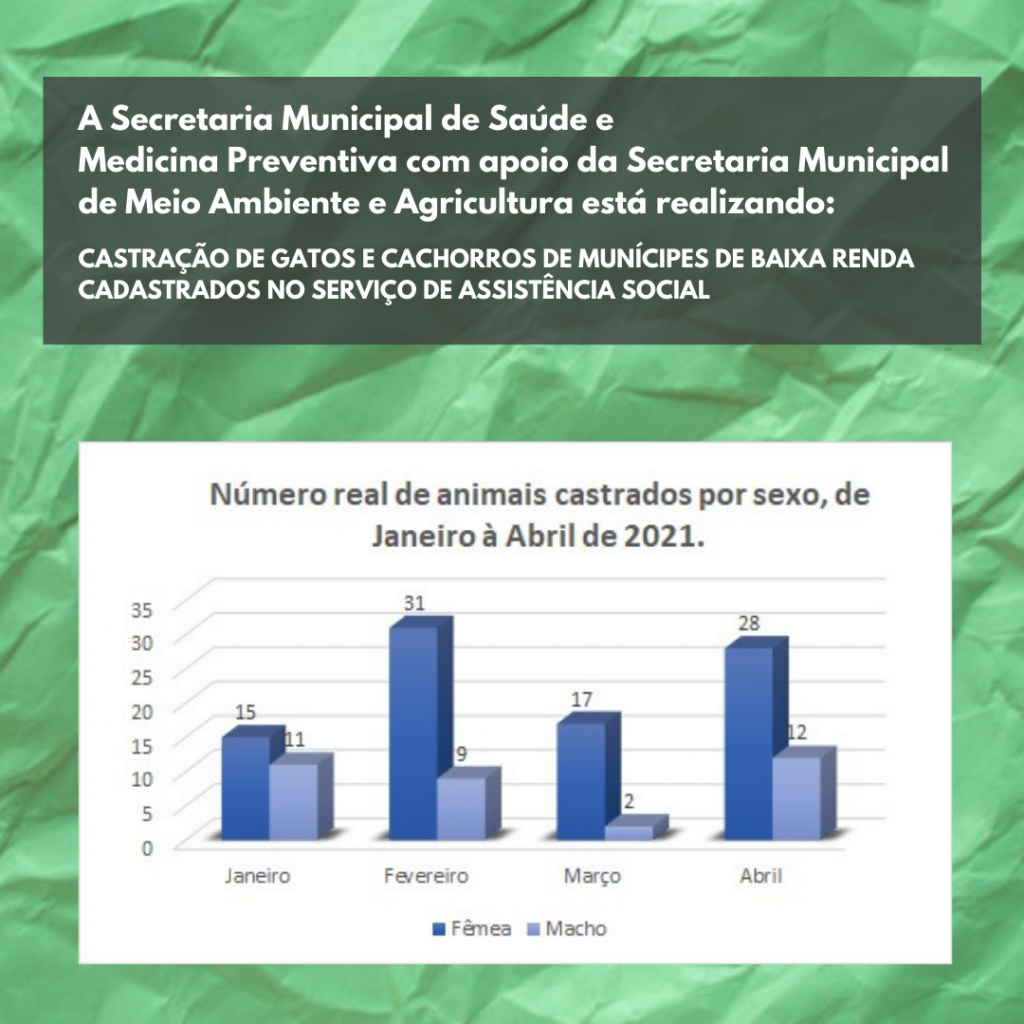 A Secretaria Municipal de Saúde e Medicina Preventiva com apoio da Secretaria Municipal de Meio Ambiente e Agricultura está realizando a castração de cães e gatos de munícipes de baixa renda que fazem parte de programas sociais! Confira o gráfico com a disposição dos dados abaixo: